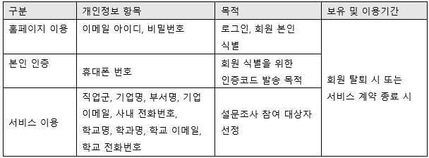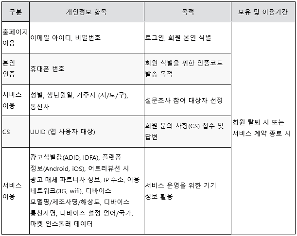 공식 홈페이지 (heypoll.co.kr, pro.tillionpanel.com)를 통해 수집 및 처리되는 이용자의 개인정보를