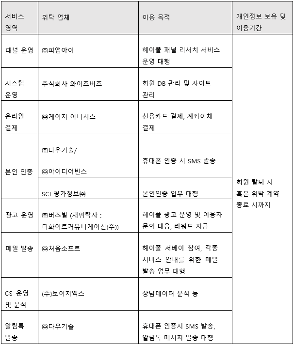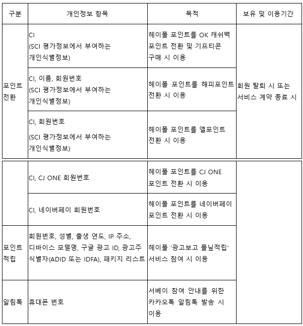 (헤이폴 포인트), 프로모션, 이벤트) 목적으로 개인정보를 처리합니다.